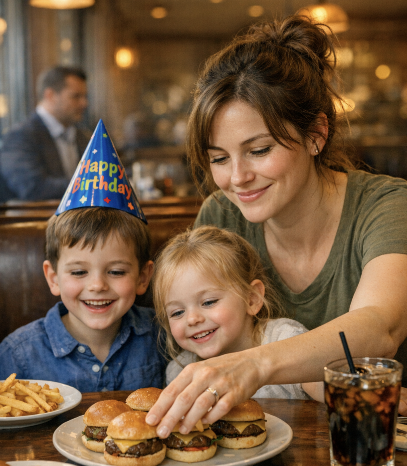 — Ты управляешь двумя детьми и превращаешь один бургер в праздничный ужин, — сказал Эдриан с лёгкой улыбкой.