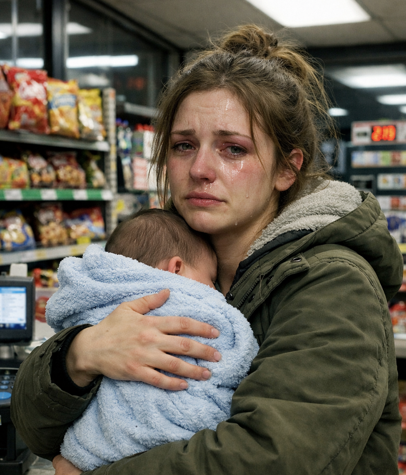 Сначала она ничего не сказала — просто медленно прошлась между стеллажами, придерживая ребёнка на бедре. Взяла маленькую коробку молока, батон белого хлеба и пачку подгузников. Ничего лишнего.