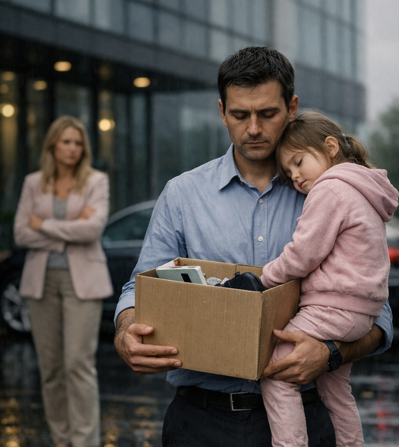 В одной руке он держал картонную коробку. В другой — тёплый вес спящей дочери. София, которой только что исполнилось четыре года, прижималась щекой к его груди, а её губы чуть приоткрылись, она дышала с той абсолютной уверенностью, которая бывает только у детей, когда они чувствуют себя в безопасности. Её волосы пахли дешёвым шампунем и детсадовским печеньем. Рафаэль прижал коробку к ноге, чтобы дипломы, маленькое комнатное растение и две фотографии не выпали — вещи, которые теперь казались реликвиями жизни, которой больше не было.